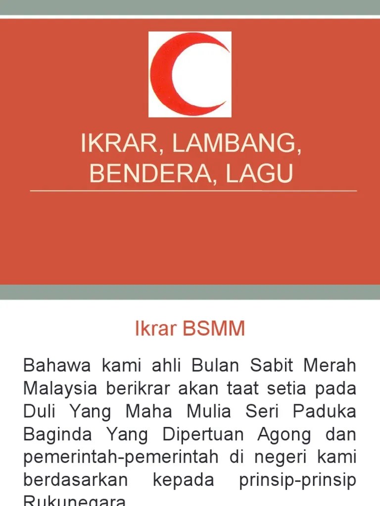 Lambang, cogan kata pbsm by tee238. Lagu bulan sabit merah malaysia was first played in a ceremony 1975 to commemorate the change of name of the society . M1 210120 perlembagaan pertubuhan ppt bulan sabit merah malaysia bsmm mpu3062 4pismp pa2 u2013 15 4pismp pc2 u2013 15 . Ikrar bsmm bahawa kami ahli bulan sabit merah malaysia berikrar akan taat setia pada duli .